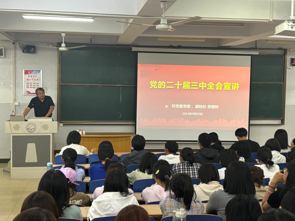 9月25日下午,公司党委常委、副董事长蒋爱林面向文法公司师生在开发区综合楼412教室集中宣讲党的二十届三中全会精神,公司师生代表百余人听取了讲座报告。